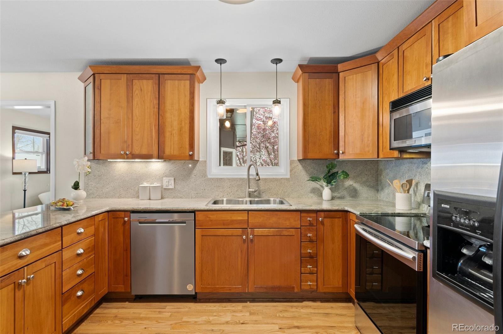 Inside, you'll find a beautifully updated mid-century ranch with designer touches throughout. Enjoy recently refinished hardwood floors, stylish new lighting, and farmhouse charm throughout the home. The chef's kitchen is as inviting as it is functional, featuring upgraded cabinetry, slab granite, stainless appliances, and a large peninsula perfect for gathering with friends and family.